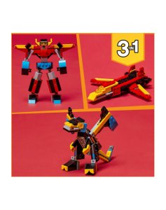 Dieses LEGO Creator 3-in-1-Bauset bietet Kindern 3 verschiedene Bauerlebnisse. Sie können einen beweglichen Superroboter mit zwei Flügeln auf dem Rücken bauen und ihn dann in einen ebenso mobilen mechanischen Drachen oder einen Jet mit verstellbaren Flügeln umbauen.