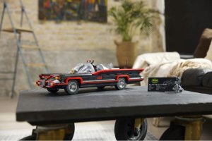 Authentisches Zubehör – Dieses Sammlermodell enthält eine Infotafel und eine Batman-Minifigur im Stil von 1966.