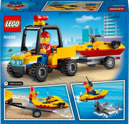 It includes a model of a quad bike with an opening protective cage and a trailer for transporting a jet ski. Plus, kids can look forward to a lifeguard minifigure and a shark figure, so they're all set for a beach adventure.