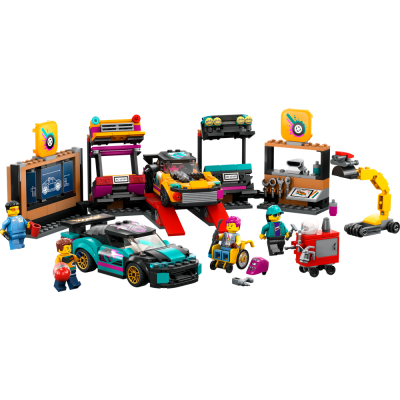 • What's in the box? – All kids need to create a custom car workshop with a configuration wall, ramps, engine lift and 2 customisable cars, plus 2 mechanic and 2 driver minifigures