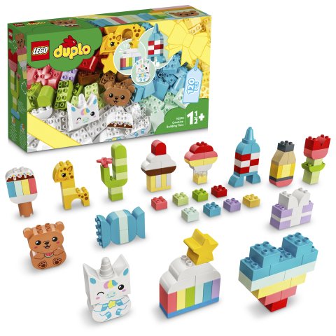 Introduce preschoolers aged 18 months and up to creative construction with LEGO® DUPLO® Creative Building Time (10978). Easy-to-build animals and much more Kids combine the colourful assortment of toddler-friendly building bricks to create familiar objects – such as a rocket, heart, star, cake, unicorn, giraffe and a bear – and enjoy endless free-building fun. With colourful shapes and many models to make, this engaging playset effortlessly blends skill-building discovery with joyful, open-ended play. Playful learning for toddlers Parents can share precious developmental milestones as LEGO DUPLO toys put open-ended fun, self-expression and confidence into young children’s hands.