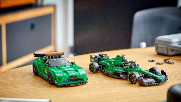 The Aston Martin Safety Car boasts a range of authentic design elements inspired by the real car, including a roof light bar, a sticker with a light control button inside the cockpit and taillights. The AMR23 race car has a safety halo, rear wing and is decorated with sponsor logos. Each model also includes a driver minifigure, which children can put behind the wheel and then go for a ride around the track.