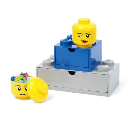 LEGO mini hlavy jsou stohovatelné a perfektně sednou i na LEGO stolní boxy se zásuvkou.