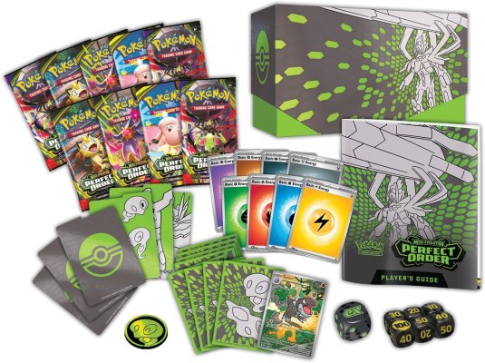 Pokémon Elite Trainer Box Perfect Order je balení 9 balíčků Pokémon karet, promo kartu a mnoha dalších doplňků. V každém balíčku najdete 10 karet. Celkem tak získáte 90 karet, promo kartu a doplňky.