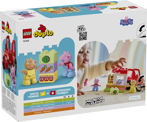Pomôžte batoľatám rozvíjať kreativitu so stavebnicou Prasiatko Peppa Traktor a Tržnice (10468). Deti od 2 rokov si užijú nápadité hranie na prevádzku farmárskeho obchodu a predaj potravín z kociek LEGO® DUPLO®. Táto stavebnica obsahuje figúrku poníka Pétia Prasiatka Peppy, pojazdný červený traktor a kocky v podobe mrkvy, melónu a pohára marmelády. Táto vzdelávacia hračka pre batoľatá pomáha rozvíjať ich schopnosti a zručnosti. Pozorovaním a napodobňovaním scén zo seriálu môžu deti zlepšiť svoje kog nitívne schopnosti, ako je riešenie problémov a trénovanie pamäte. Na zostavenie traktora a stajne využijú malí stavitelia svoje jemné motorické schopnosti. Stavebnica obsahuje menu zdobené melónom, mrkvou a pohármi s marmeládou. Batoľatá si precvičia rozpoznávanie a priraďovanie čísel pri hľadaní zodpovedajúcej zdobenej kocky. Stavebnica obsahuje 18 dielikov.