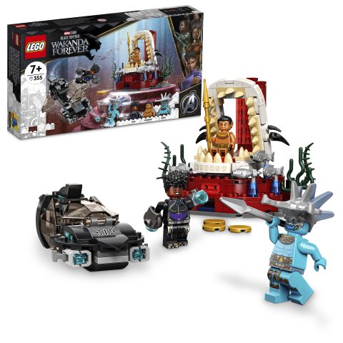 V stavebnici trónnej siene kráľa Namora od LEGO® Marvel (76213) na superhrdinov od 7 rokov čaká nápaditá podmorská akcia. Podmorské dobrodružstvá pre fanúšikov Black Panthera Toto elegantné a štýlové prevedenie ponorky Skirmisher z filmu Black Panther: Navždy Wakanda od štúdia Marvel má vystreľovače výstupkov, takže deti môžu v boji proti zloduchovi Attumovi strieľať projektily. Na konci plavby ponorkou objavia palác kráľa Namora a riasami zdobenú trónnu sieň kráľa. Keď sa misia skončí, deti sa vrátia k ponorke a vyrazia za ďalším z mnohých podmorských dobrodružstiev. Stavebnica obsahuje 3 minifigúrky – Shuri, Attumu a kráľa Namora a nechýba ani celý rad parádnych zbraní a doplnkov.