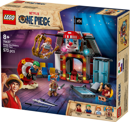 Súčasťou stavebnice sú minifigúrky Luffyho, Zora, Nami a pirátskeho kapitána Klauna Buggyho. Zostaviteľný stan je možné otočiť a vytvoriť tak väčšiu hraciu plochu s odnímateľnými časťami so stoličkami a Buggyho trónom. Súčasťou sú aj 3 cirkusové pasce, z ktorých musia hrdinovia uniknúť: nádrž na vodu, otáčajúci sa terč a závesná klietka. Vnútri stanu nájdete krabice a sudy s dielikmi, z ktorých je možné postaviť menšiu verziu Buggyho. Nechýba množstvo skvelých zbraní a doplnkov, vrátane 2 plagátov hľadaných osôb. Pre ešte väčšiu porciu digitálnej zábavy môžu stavitelia približovať a otáčať modely v 3D a sledovať postup stavania pomocou intuitívnej aplikácie LEGO Builder. Stavebnica obsahuje 573 dielikov.