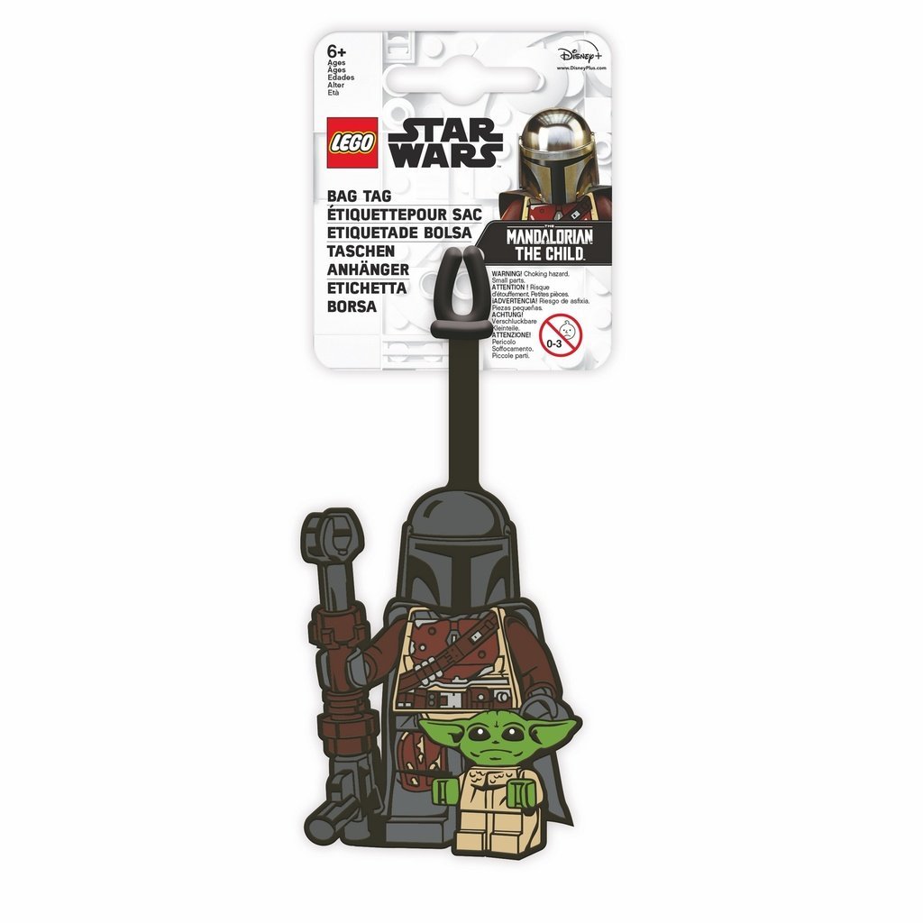 Menovka na tašku vyrobená z ohybného a odolného silikónu. S obrázkami LEGO® minifigúrok Mandaloriana a Dieťaťa a zadnou stranou s priestorom na vpísanie kontaktných údajov.